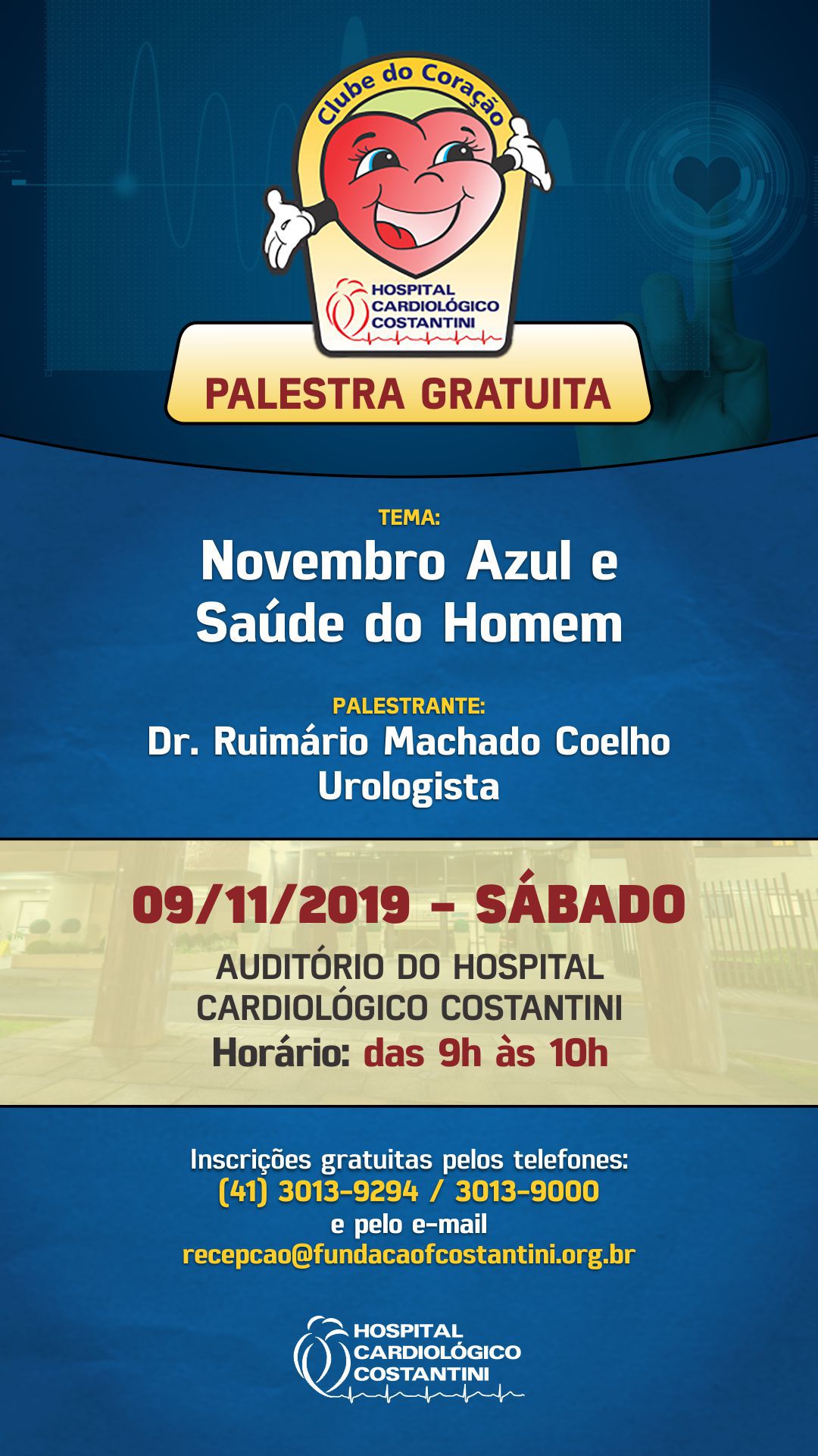 O Clube do Coração do Hospital Cardiológico Costantini, realiza, no próximo dia 09, sábado, uma palestra com o urologista Ruimário Machado Coelho sobre “Novembro Azul e Saúde do Homem”.