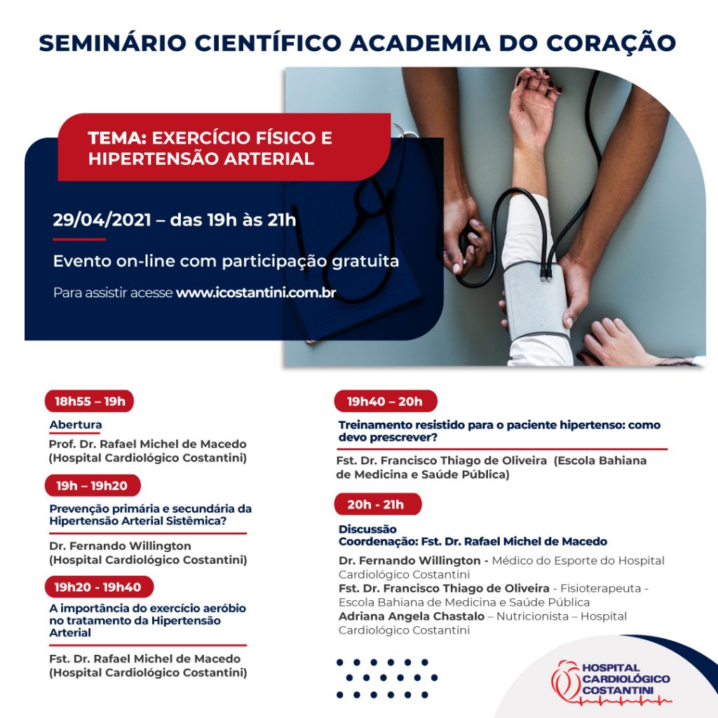 Para falar mais sobre a hipertensão arterial, seus fatores de risco e a importância da atividade física para controlar a doença, o Hospital Cardiológico Costantini promove, em parceria com a Academia do Coração, o seminário científico Exercício Físico e Hipertensão Arterial. O evento acontece de maneira on-line e gratuita, por meio da plataforma icostantini.com.br, no dia 29 (quinta-feira), das 19h às 21h. Confira a programação abaixo e participe!
